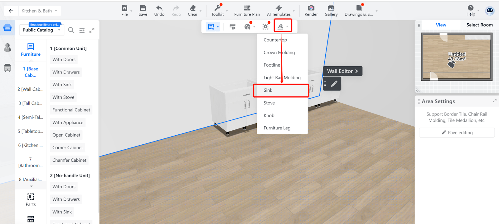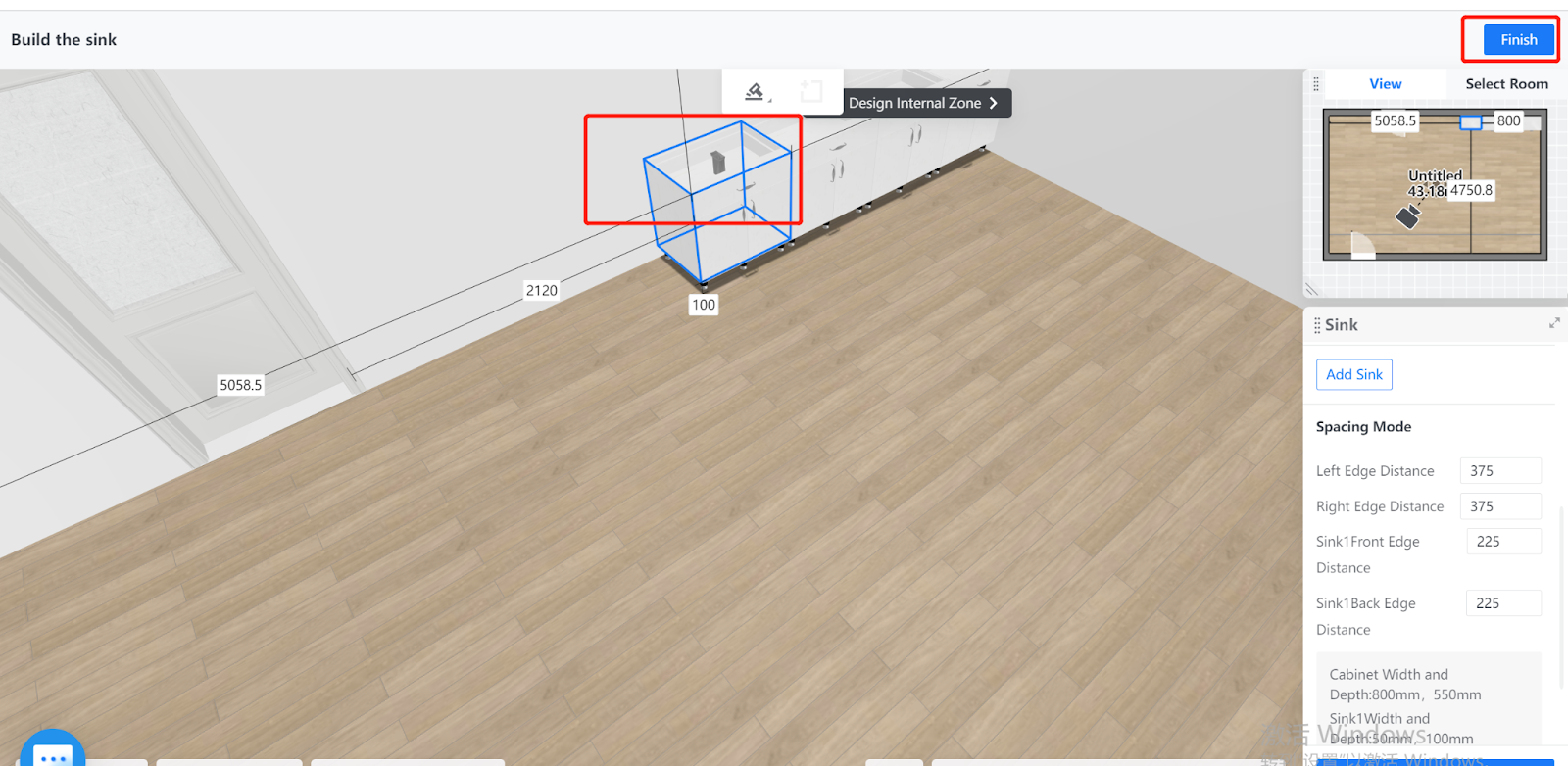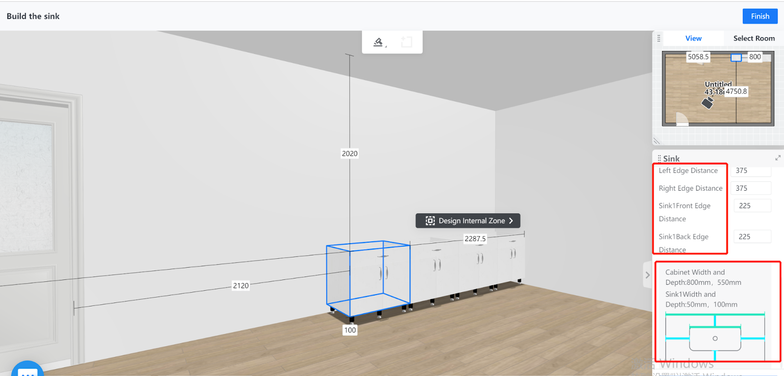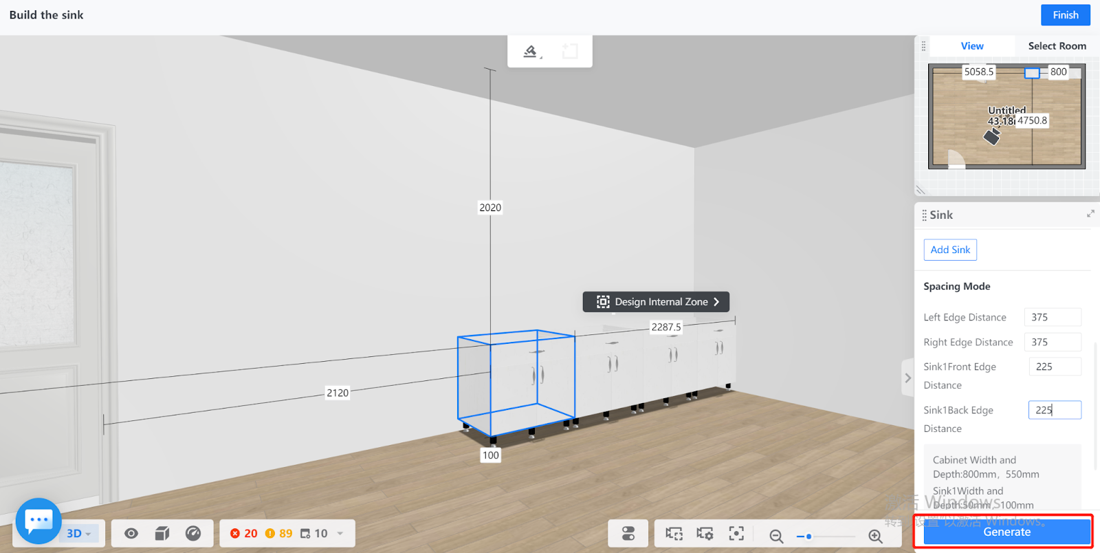 In Coohom, you can generate sinks for the cabinets that you select. You can also configure the sink that you want to generate.