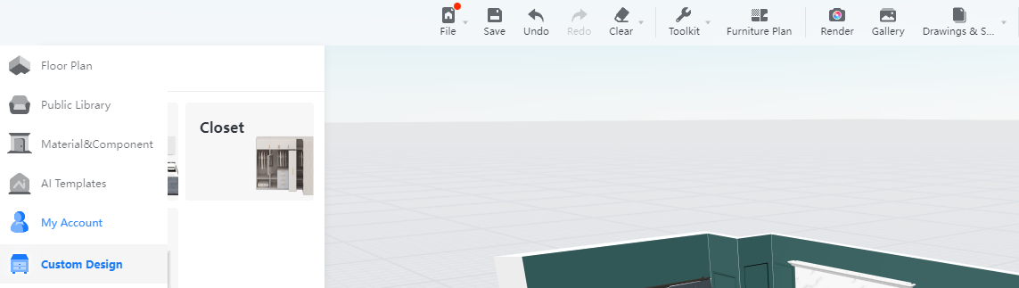 1. Enter the project that you want to work on. In the left-side navigation pane, click Custom Design. In the Custom Design panel, click Closet.