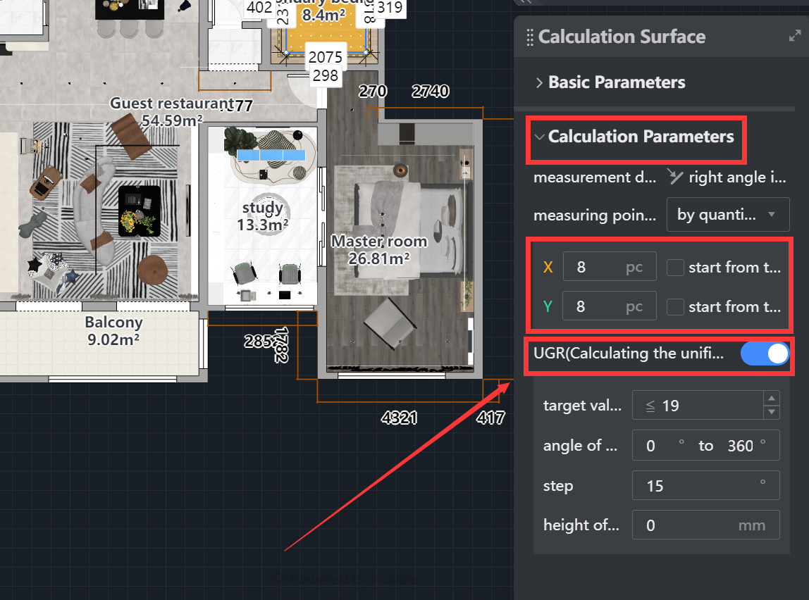 b.If you need to calculate the uniform glare value UGR, check the UGR switch.