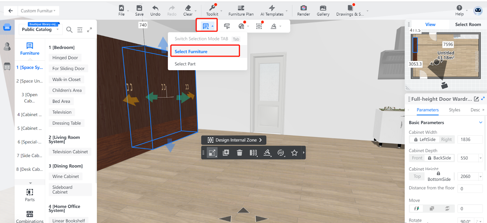 2. In the tool bar that appears, hover your mouse over the Select Furniture icon on the leftmost and click Select Furniture in the drop-down menu.