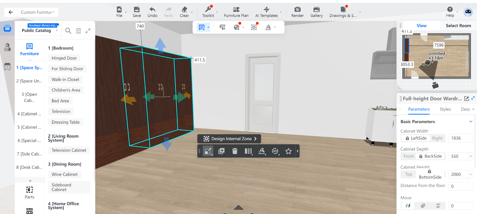 1. Enter the project that you want to work on. In the left-side navigation pane, click Custom Design. In the Custom Design panel, click Closet or Kitchen & Bath.