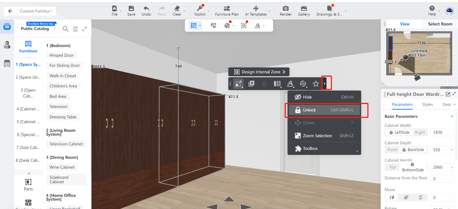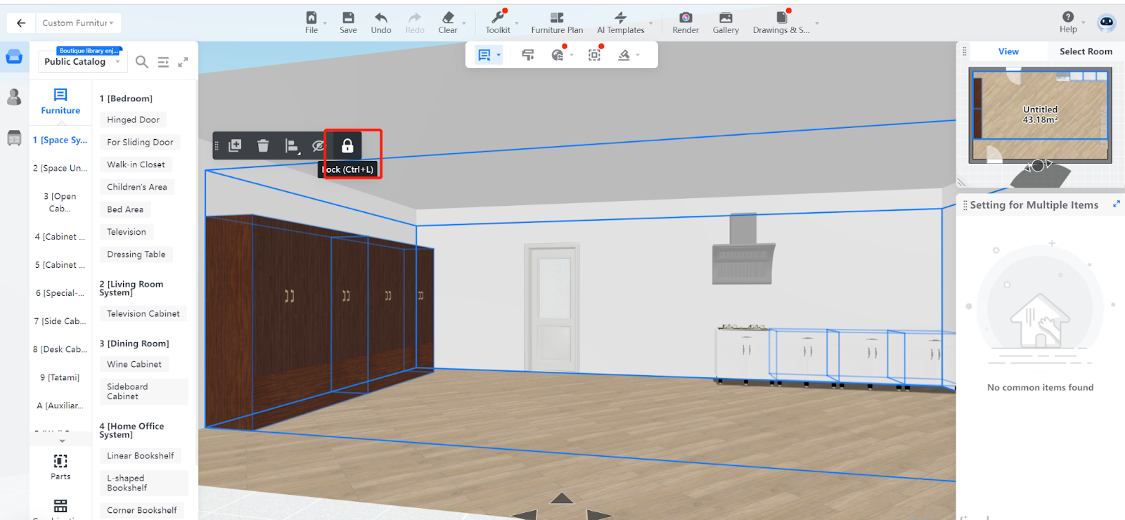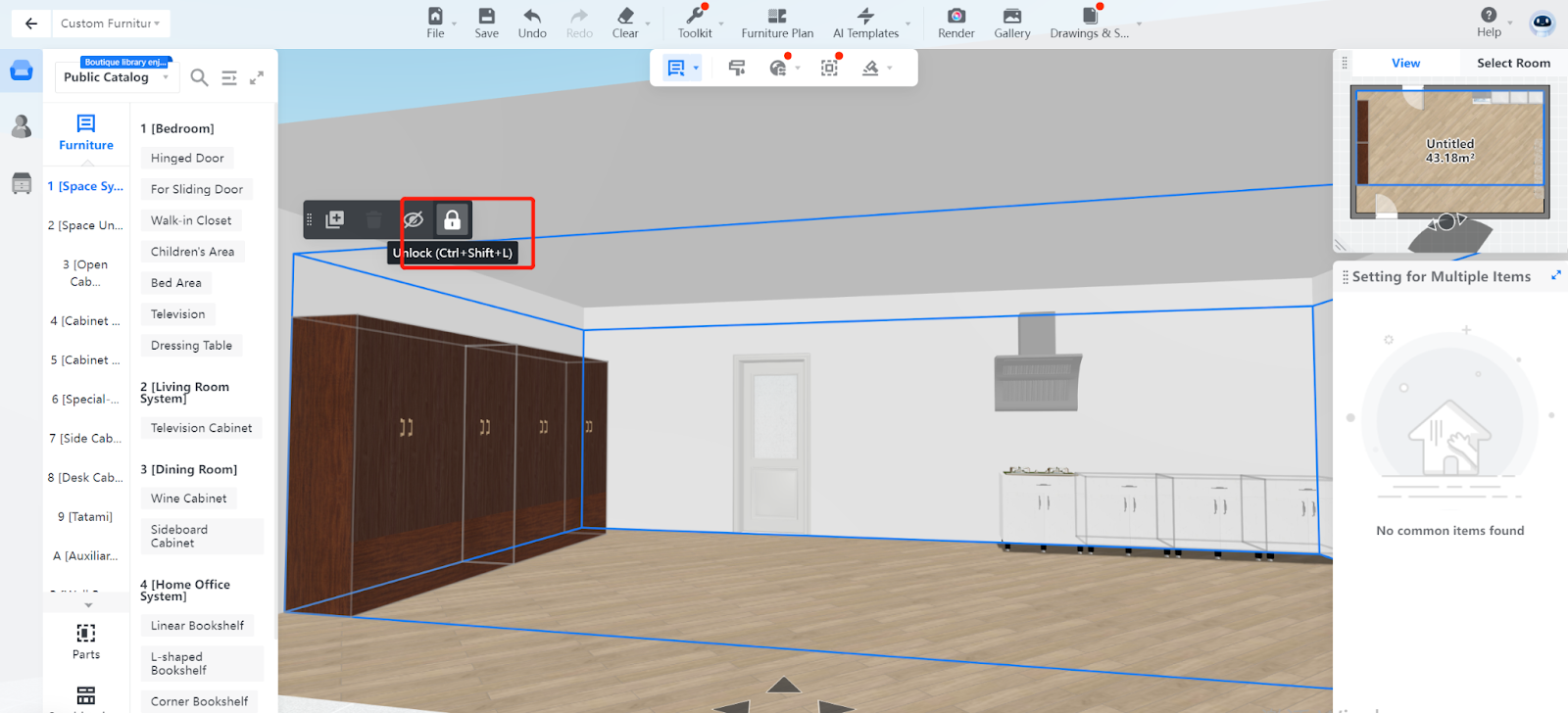 In Coohom, you can lock and unlock one or more models in the scenario, whether the models are custom-made or just regular ones.