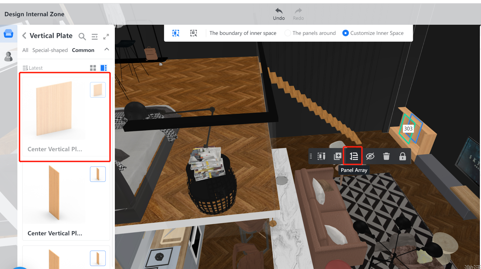 When you design the inner space of a piece of furniture, you can use the Panel Array feature to place panels evenly in vertical or horizontal distribution inside the furniture. This way, placing panels can be easier and faster.