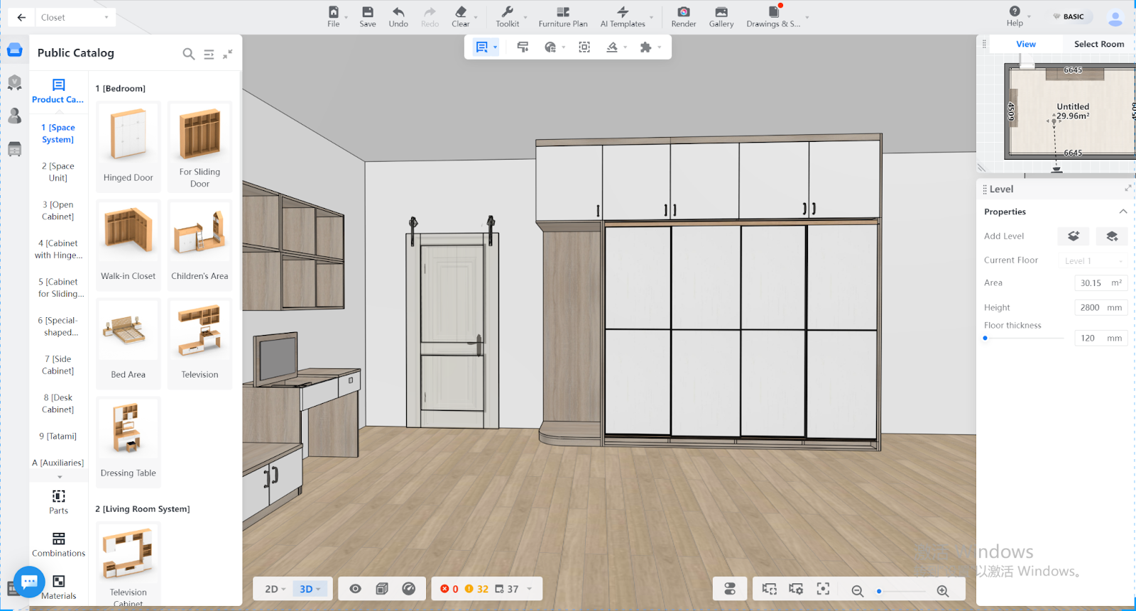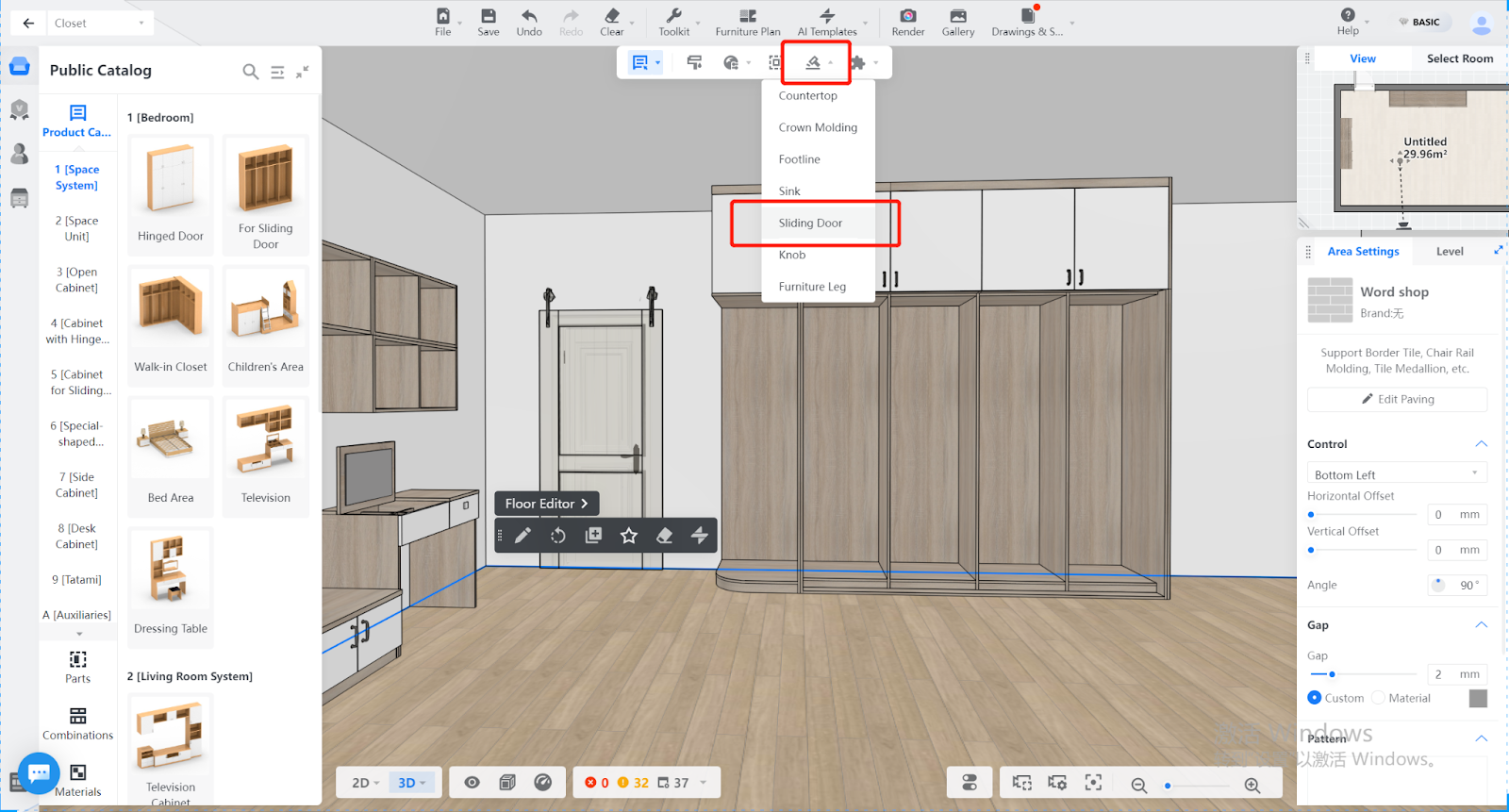 One-click generation of sliding doors, countertops, furniture leg, footline, crown modeling, knob, stoves, sinks, etc.