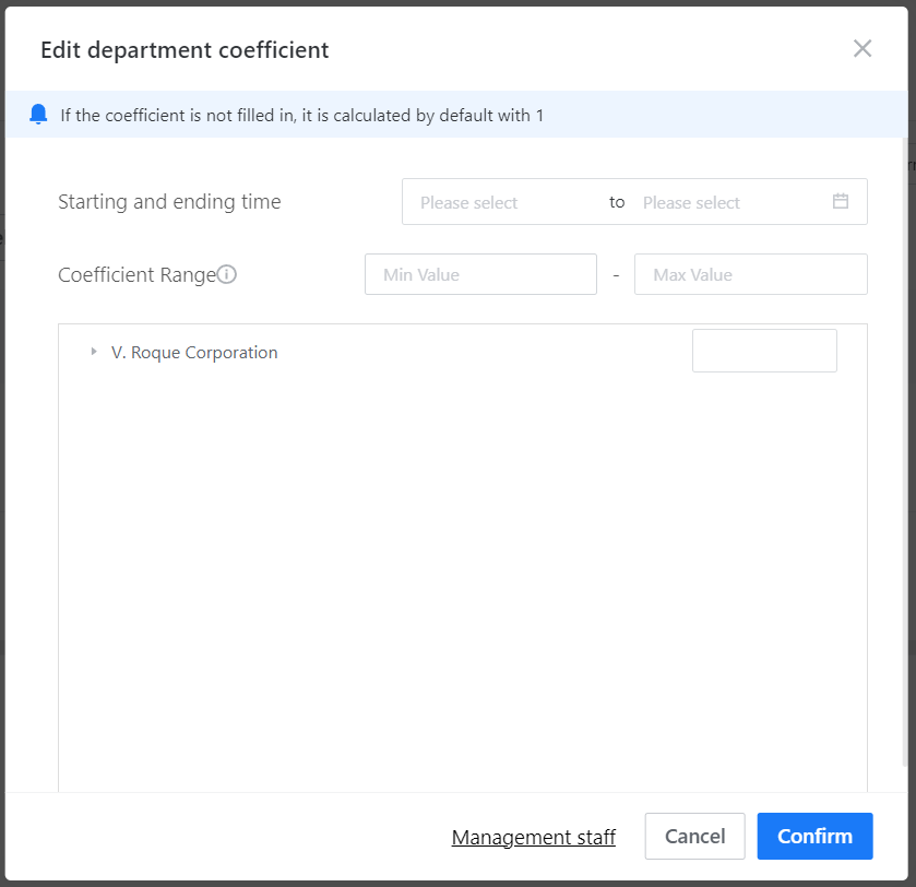2.2Click the "Department Coefficient" button in the single quote rule to enter the group coefficient editing page. Enter the effective time of the coefficient and the coefficient value of each grouping, and the coefficients for different groups of the quote rule will be different after completion.