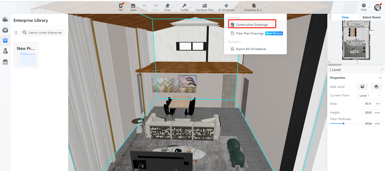 1. Enter the project that you want to work on. Hover your mouse over Drawings & Schedules in the top bar. In the drop-down menu, click on Construction Drawings.