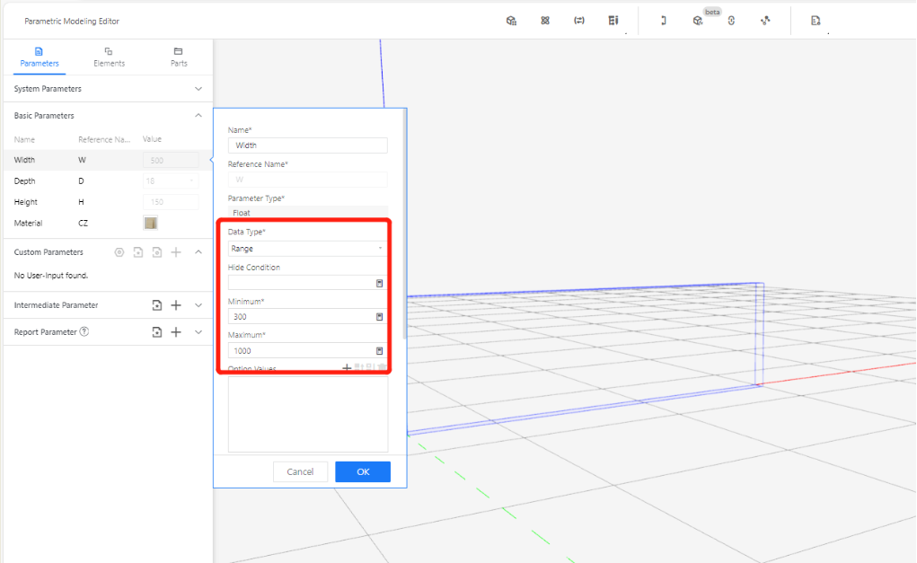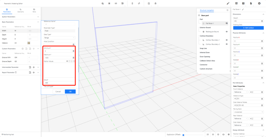 2.2.1 Width (W) - Represents the size of the model panel in the X-axis direction. Set the value type as a range (e.g., range 5-1000, current value: 600).