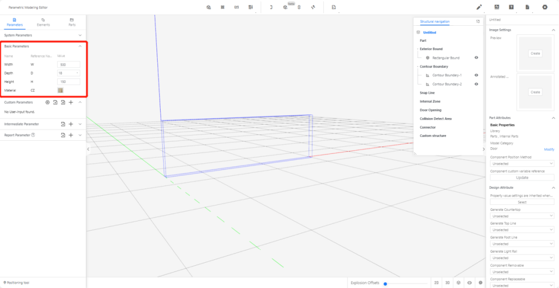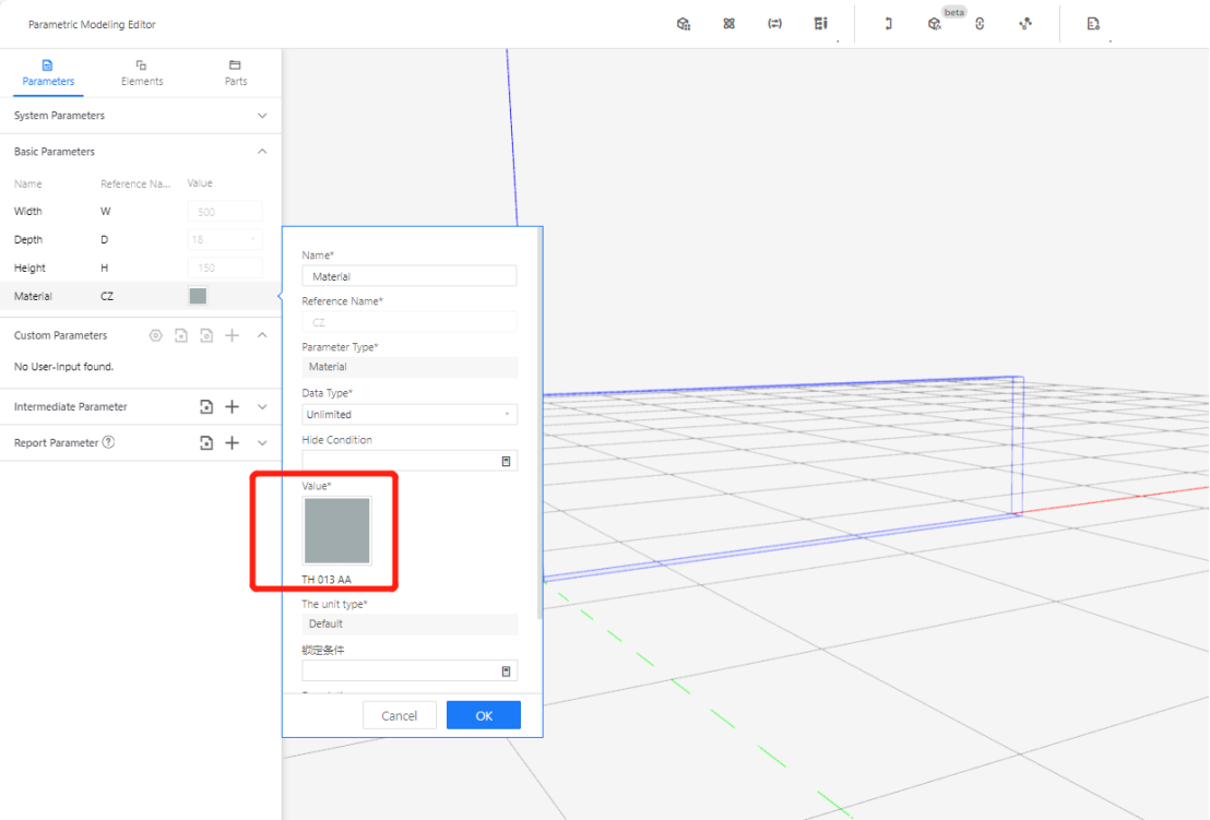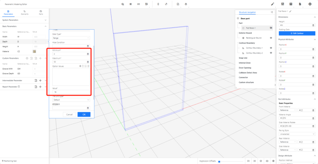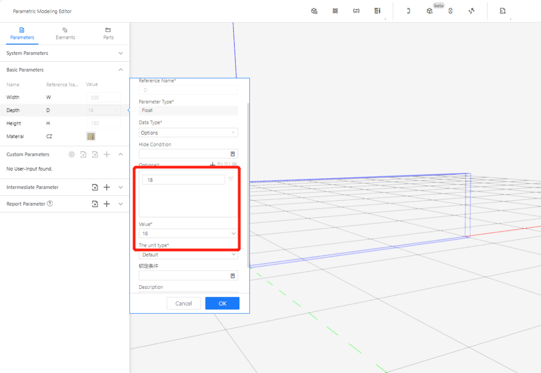 2.2.2 Depth (D) - Represents the size of the model panel in the Y-axis direction. Set the value type as a options (e.g., optional 18, current value: 18).