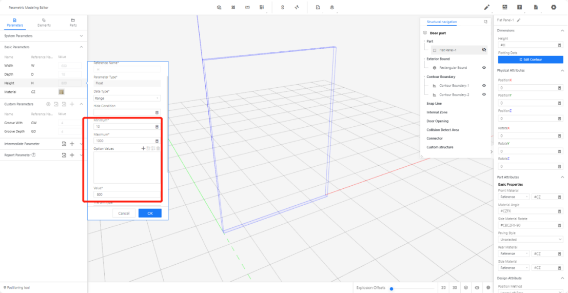2.2.3 Height (H) - Represents the size of the model panel in the Z-axis direction. Set the value type as a range (e.g., range10-1000, current value: 800).