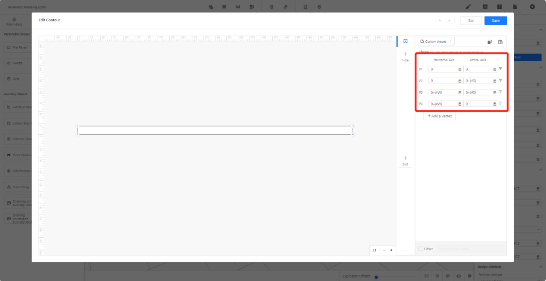 Set four points: point 1(0,0),point 2(0,#D),point 3(#W,#D),point 4(#W,0)