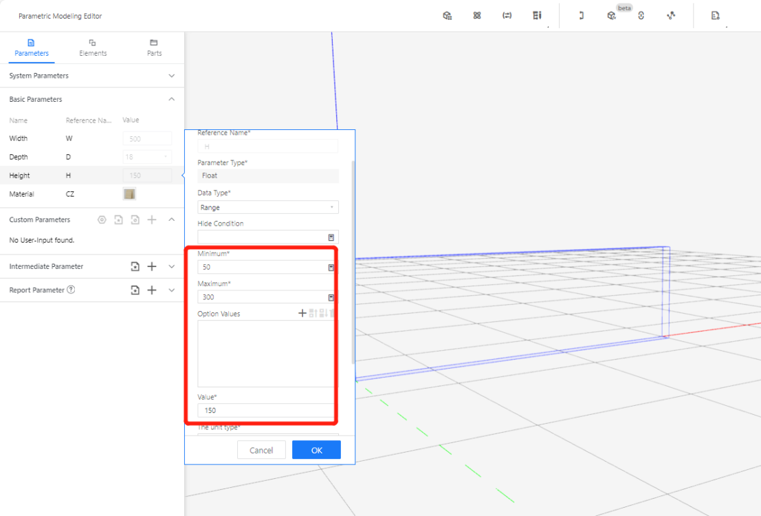 5.1.3 Height (H) - Represents the size of the model panel in the Z-axis direction. Set the value type as a range (e.g., range50-300, current value: 150).