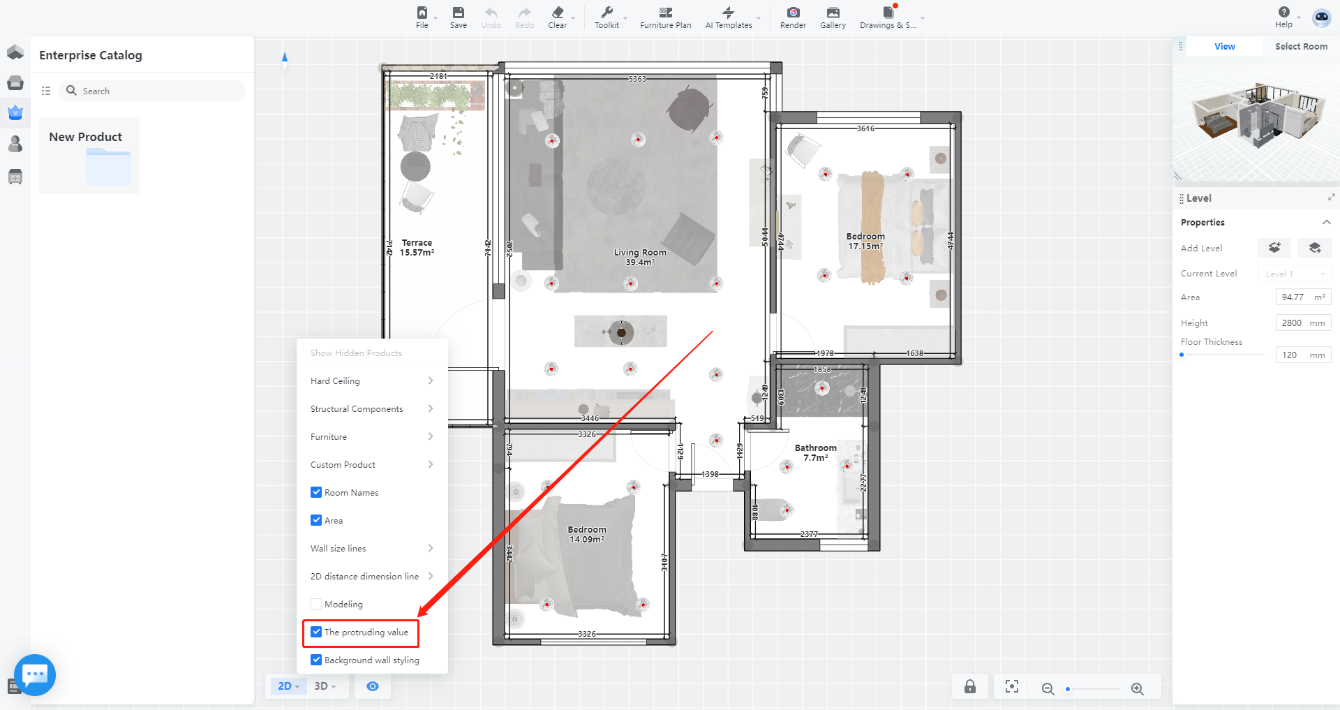 The Protruding Value in the View Function at the bottom of the toolbar helps you to see the value in 2D Ceiling View Mode.