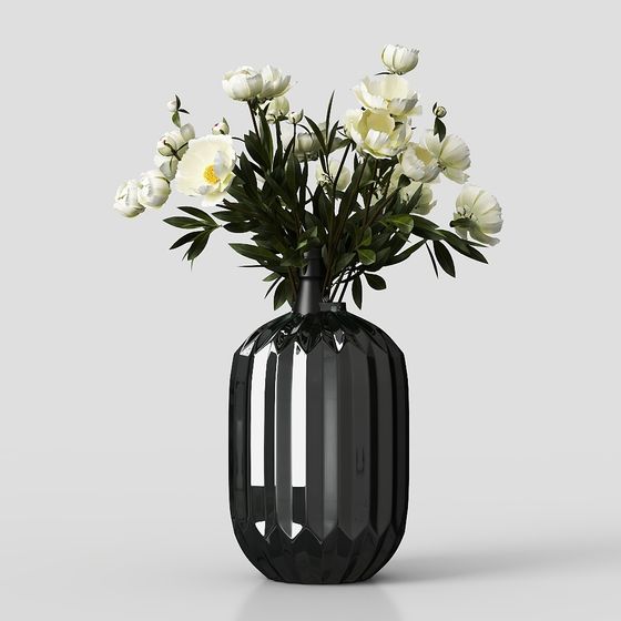 Stylishly designed low-poly crystal diamond vase 3D model made of black glass, featuring beautiful white flowers and green leaves. Ideal for various applications including home decor and virtual reality setups, it elegantly enhances space aesthetics with its luxurious appearance and intricate details. Available for free use in all creative projects.