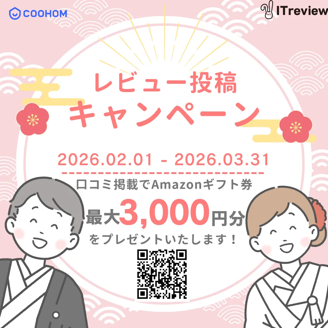 2026/04/10キャンペーン【Coohom】ITreview掲載開始のお知らせ:レビュー投稿でAmazonギフト券・PayPayポイント進呈save pinITreview 掲載開始のお知らせ最大3,000円分のギフト券をプレゼントいつも Coohom をご利用いただき、誠にありがとうございます。この度、Coohomは国内最大級のIT製品レビュープラットフォーム「ITreview」に正式に掲載されました。キャンペーン限定特典Amazonギフトカード 最大3,000円分+ PayPayポイント進呈キャンペーンの付与条件・詳細はこちらぜひお聞かせいただきたい内容レンダリングの作成スピードや品質について操作のしやすさ、素材ライブラリの充実度について導入後、商談やプレゼンにおいてどのような効果があったか