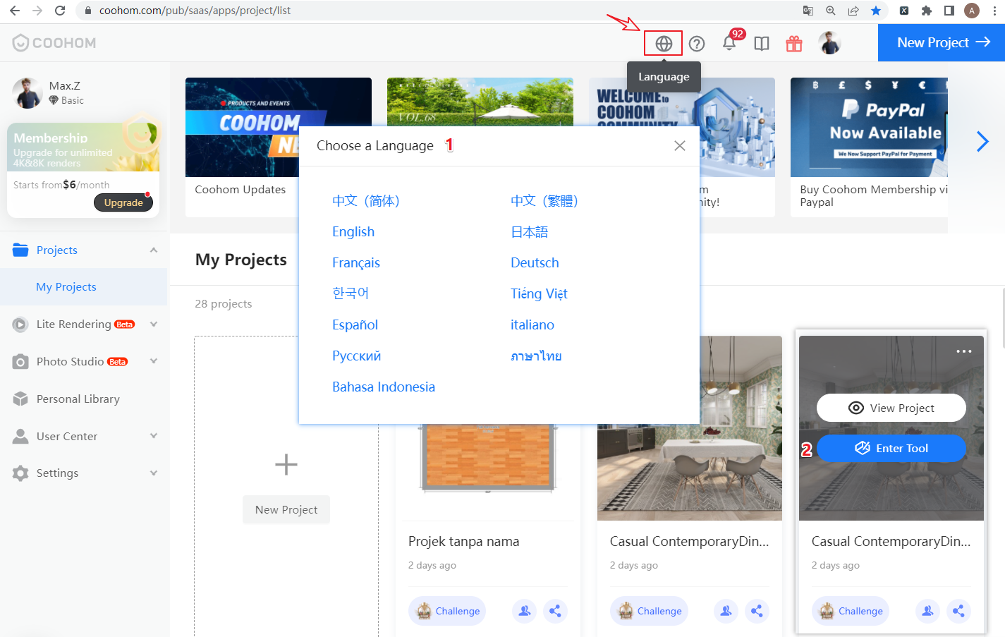 Method 1: In your Coohom Workspace, first switch the language to Indonesian, Spanish, Vietnamese, Korean, or Japanese, and then enter your Project or create a New Project.